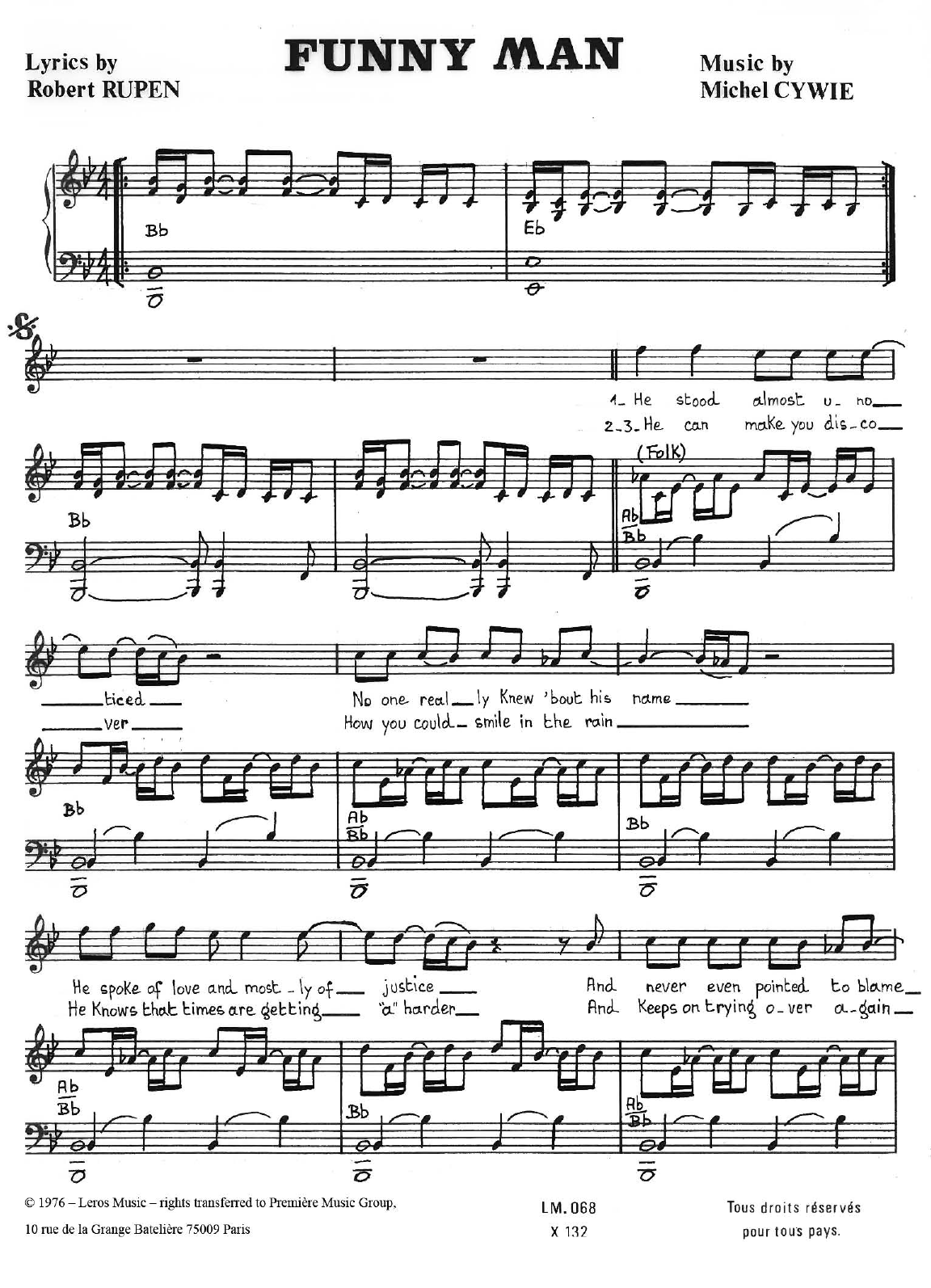Download or print Michel Cywie Funny Man sheet music, chords and digital score arranged for Piano, Vocal & Guitar Chords. This Standards score includes 2 page(s).