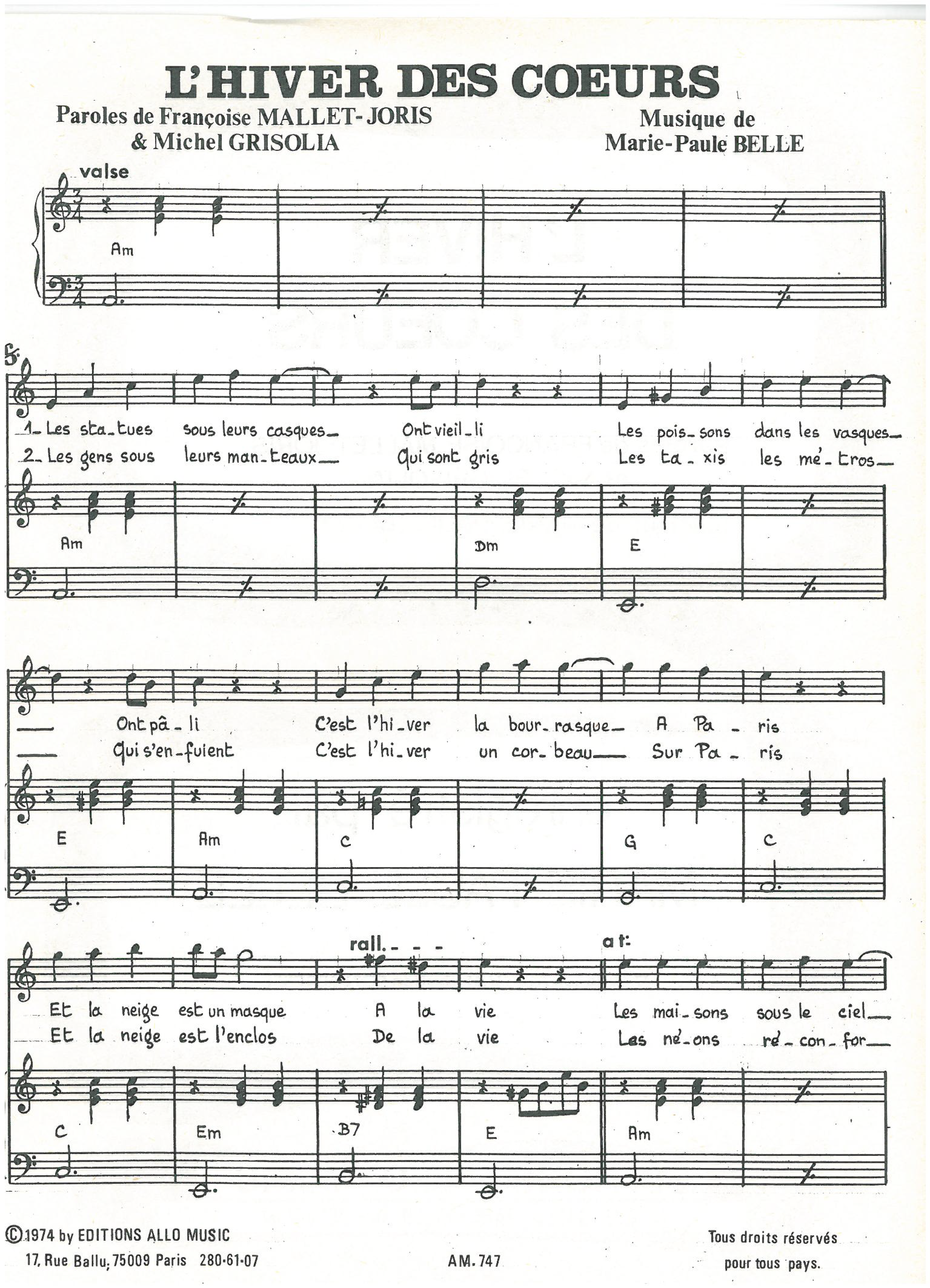 Download or print Michel Grisolia, Françoise Mallet-Joris, Marie Paule Belle L'hiver Des Coeurs sheet music, chords and digital score arranged for Piano & Vocal. This Classical score includes 3 page(s).