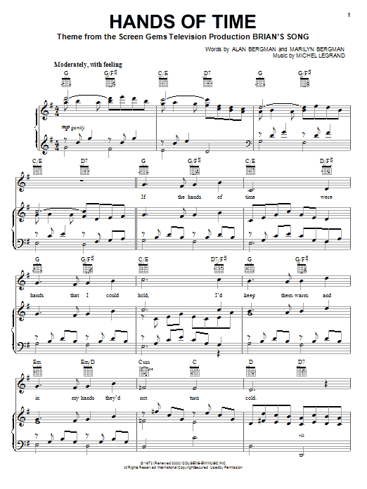 Download or print Michel LeGrand Hands Of Time sheet music, chords and digital score arranged for Piano, Vocal & Guitar Chords (Right-Hand Melody). This Film/TV score includes 3 page(s).