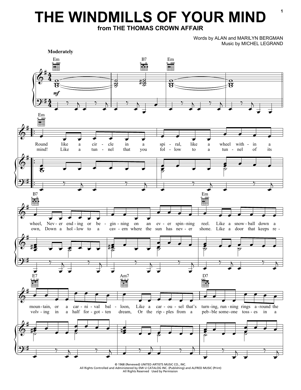 Download or print Michel LeGrand The Windmills Of Your Mind sheet music, chords and digital score arranged for Very Easy Piano. This Jazz score includes 5 page(s).