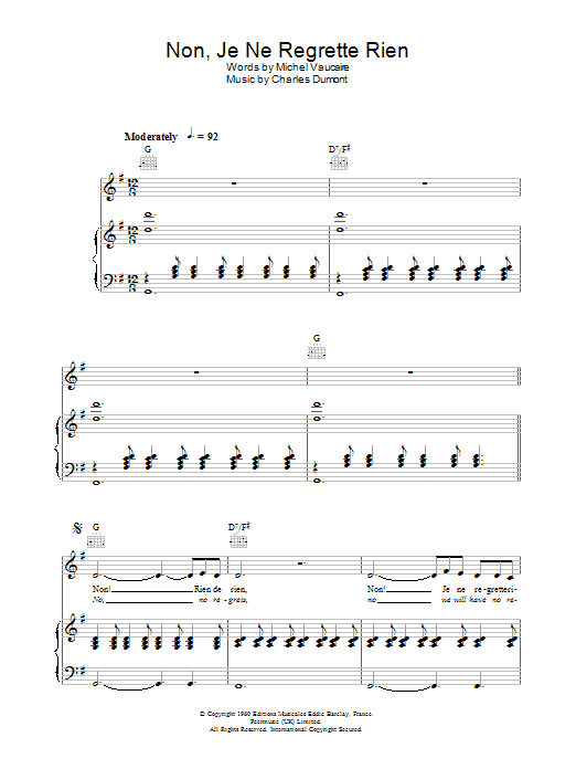 Download or print Edith Piaf Non, Je Ne Regrette Rien sheet music, chords and digital score arranged for Piano, Vocal & Guitar Chords (Right-Hand Melody). This French score includes 4 page(s).