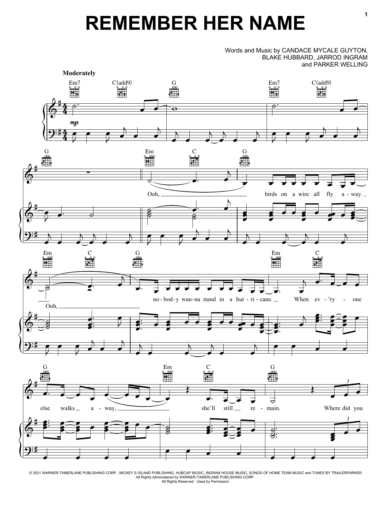 Download or print Mickey Guyton Remember Her Name sheet music, chords and digital score arranged for Piano, Vocal & Guitar Chords (Right-Hand Melody). This Country score includes 5 page(s).