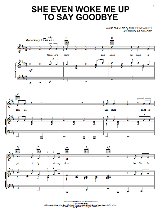 Download or print Mickey Newbury She Even Woke Me Up To Say Goodbye sheet music, chords and digital score arranged for Piano, Vocal & Guitar Chords (Right-Hand Melody). This Country score includes 5 page(s).