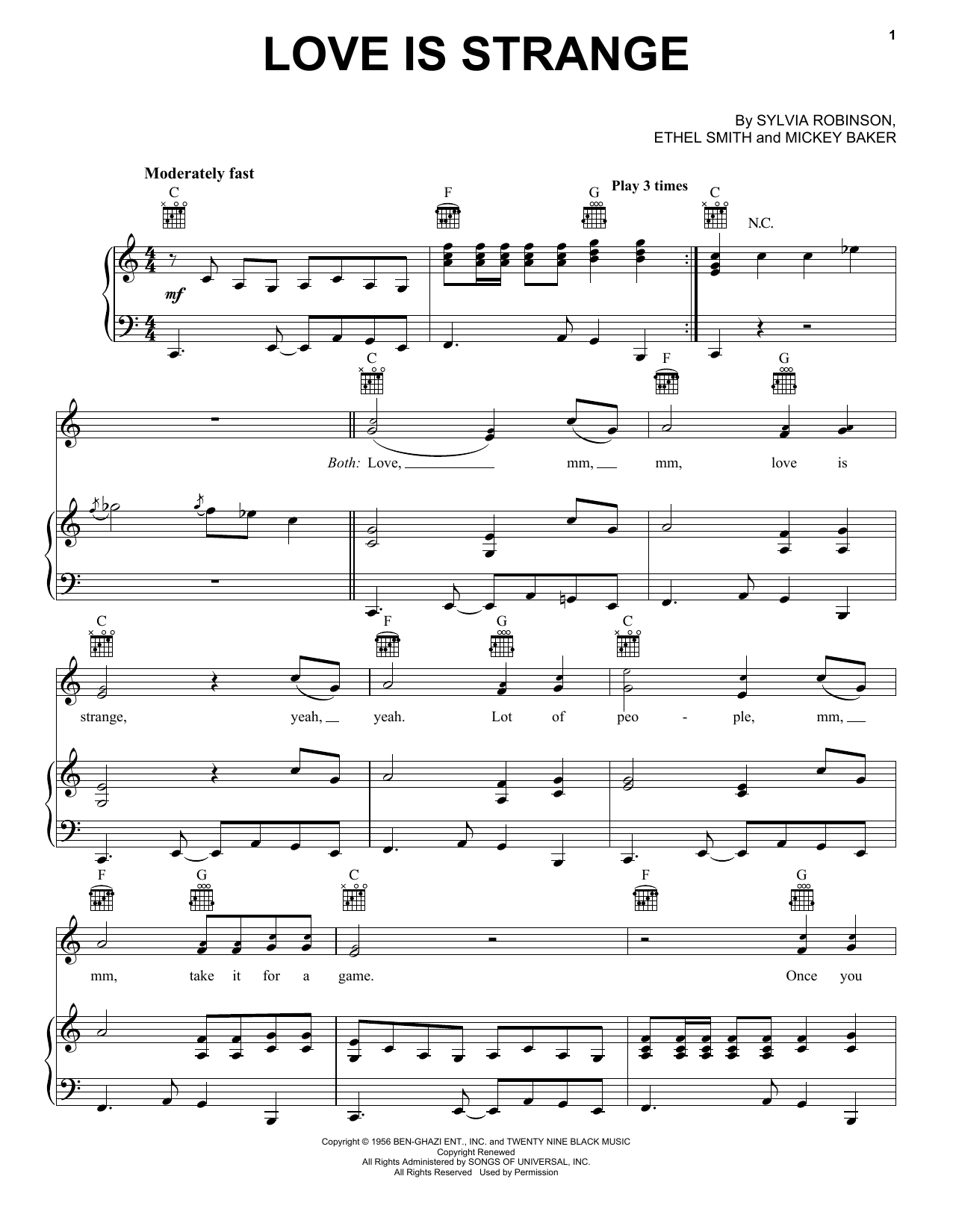 Download or print Mickey & Sylvia Love Is Strange sheet music, chords and digital score arranged for Guitar Chords/Lyrics. This Pop score includes 2 page(s).