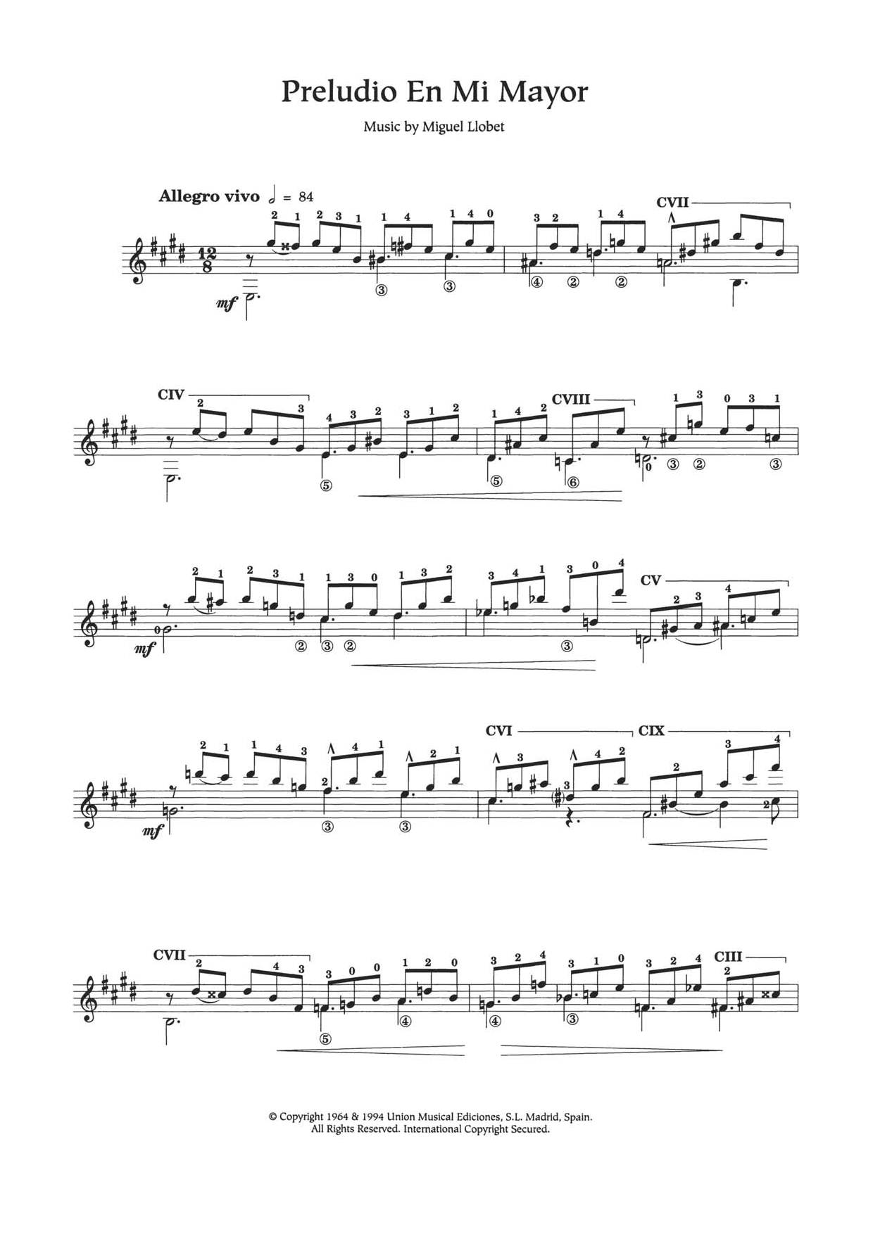 Download or print Miguel Llobet Preludio En Mi Major sheet music, chords and digital score arranged for Easy Guitar. This Classical score includes 3 page(s).