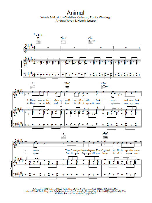 Download or print Miike Snow Animal sheet music, chords and digital score arranged for Piano, Vocal & Guitar Chords. This Pop score includes 7 page(s).