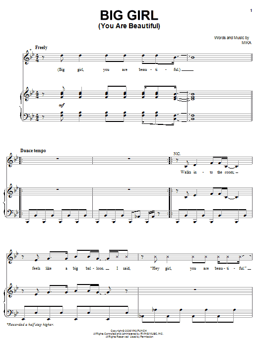 Download or print Mika Big Girl (You Are Beautiful) sheet music, chords and digital score arranged for Piano, Vocal & Guitar Chords (Right-Hand Melody). This Pop score includes 8 page(s).