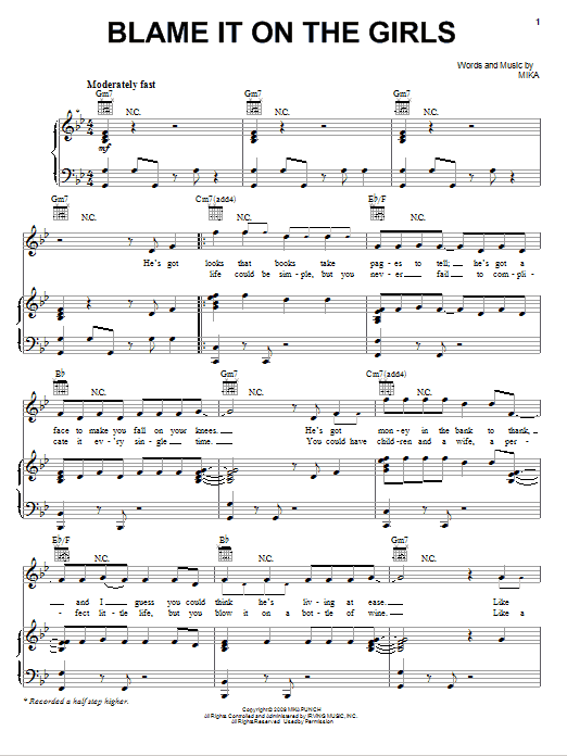 Download or print Mika Blame It On The Girls sheet music, chords and digital score arranged for Piano, Vocal & Guitar Chords (Right-Hand Melody). This Pop score includes 6 page(s).