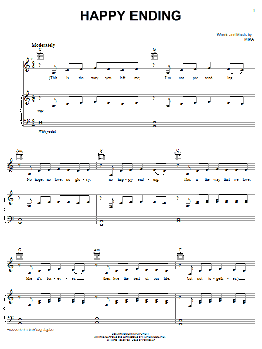Download or print Mika Happy Ending sheet music, chords and digital score arranged for Piano, Vocal & Guitar Chords (Right-Hand Melody). This Pop score includes 8 page(s).