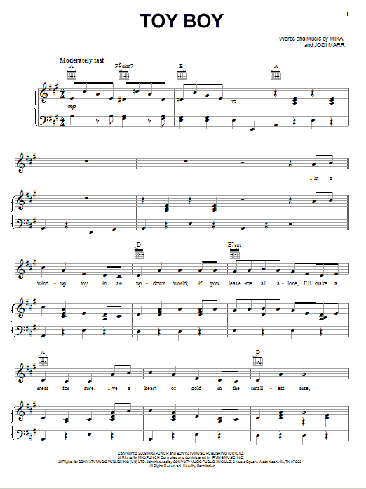 Download or print Mika Toy Boy sheet music, chords and digital score arranged for Piano, Vocal & Guitar Chords (Right-Hand Melody). This Pop score includes 5 page(s).