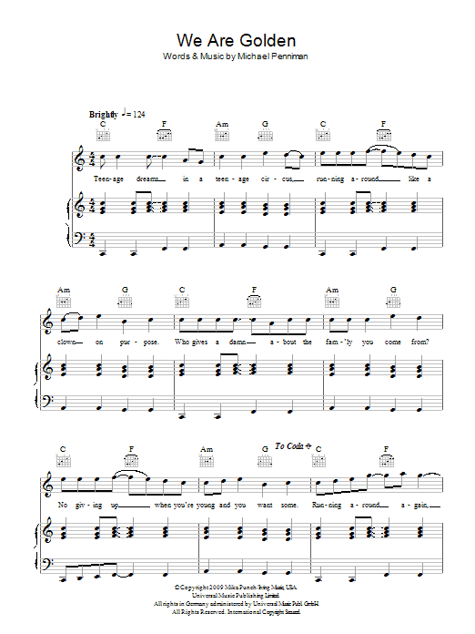 Download or print Mika We Are Golden sheet music, chords and digital score arranged for Piano, Vocal & Guitar Chords (Right-Hand Melody). This Pop score includes 8 page(s).