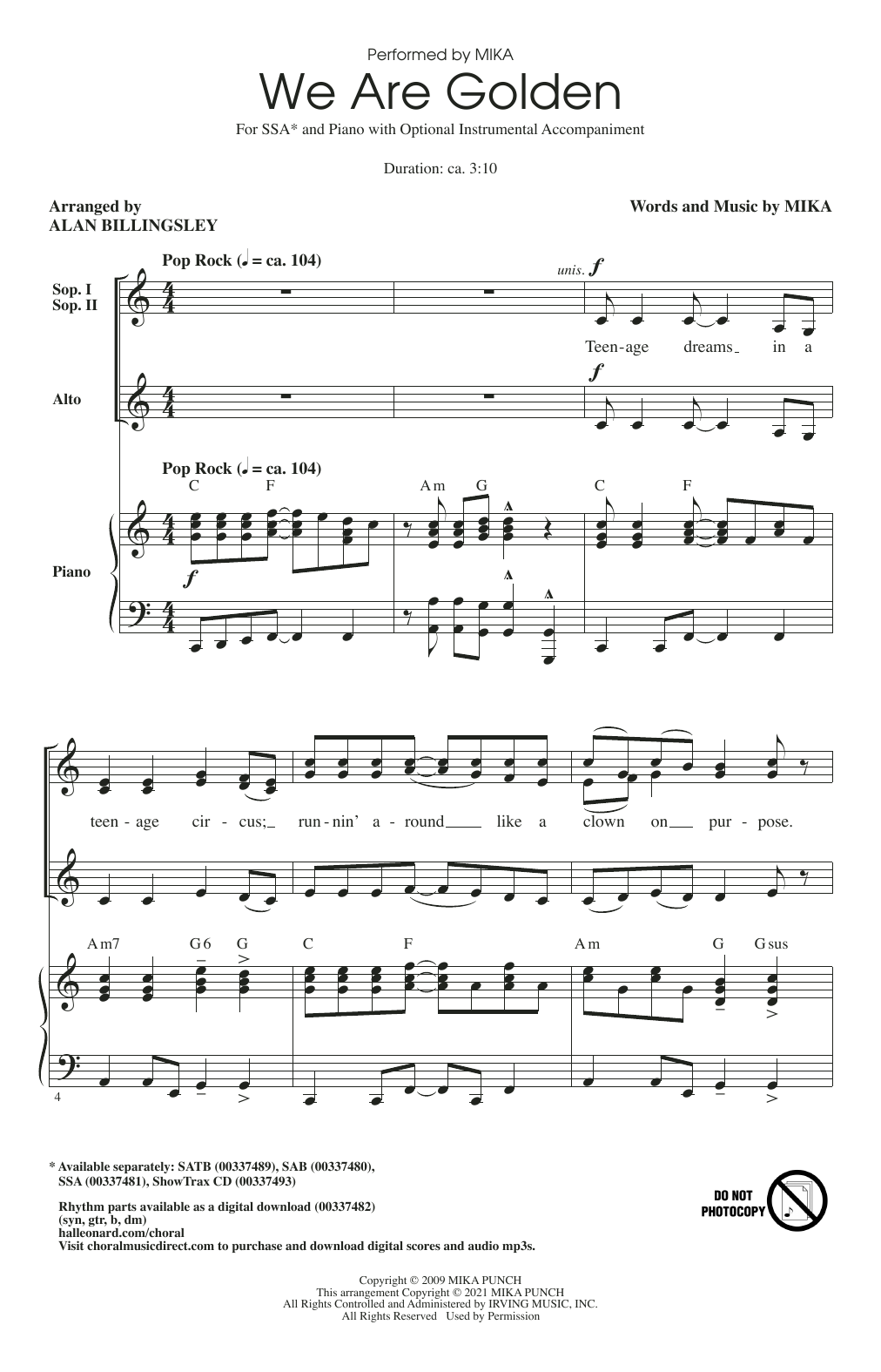 Download or print Mika We Are Golden (arr. Alan Billingsley) sheet music, chords and digital score arranged for SSA Choir. This Alternative score includes 11 page(s).