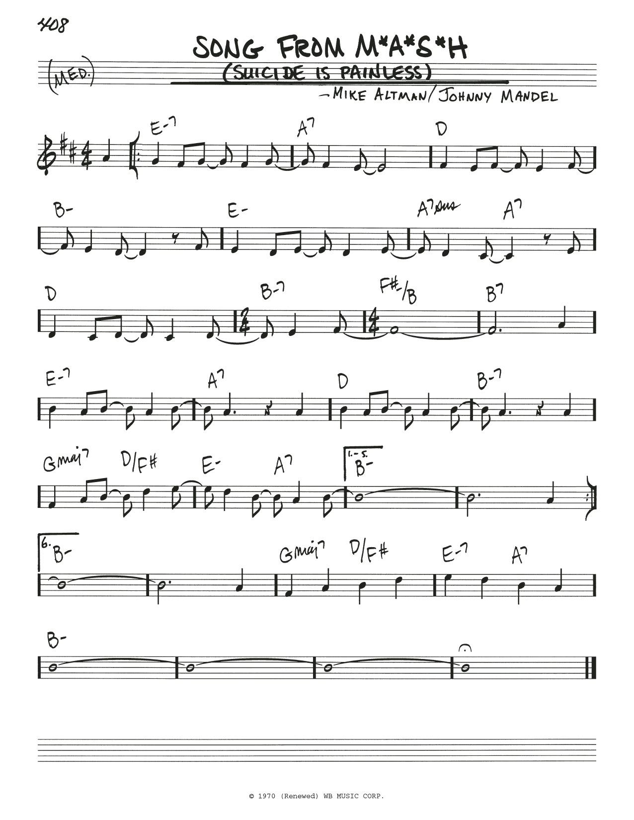 Download or print Mike Altman Song From M*A*S*H (Suicide Is Painless) sheet music, chords and digital score arranged for Real Book – Melody & Chords. This Jazz score includes 1 page(s).
