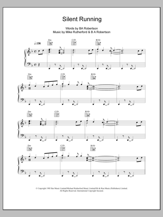 Download or print Mike + The Mechanics Silent Running sheet music, chords and digital score arranged for Piano, Vocal & Guitar Chords. This Pop score includes 5 page(s).