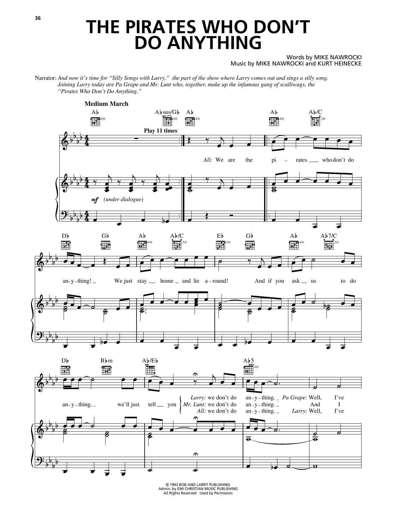 Download or print Mike Nawrocki The Pirates Who Don't Do Anything (from VeggieTales) sheet music, chords and digital score arranged for Piano, Vocal & Guitar Chords (Right-Hand Melody). This Children score includes 4 page(s).