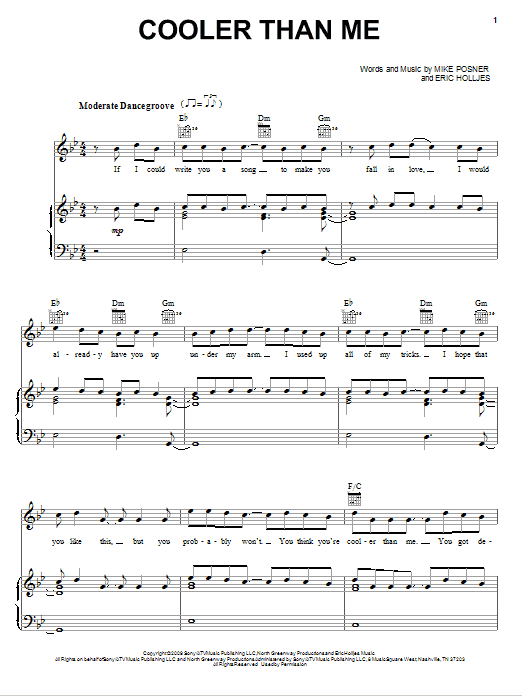 Download or print Mike Posner Cooler Than Me sheet music, chords and digital score arranged for Piano, Vocal & Guitar Chords (Right-Hand Melody). This Pop score includes 8 page(s).