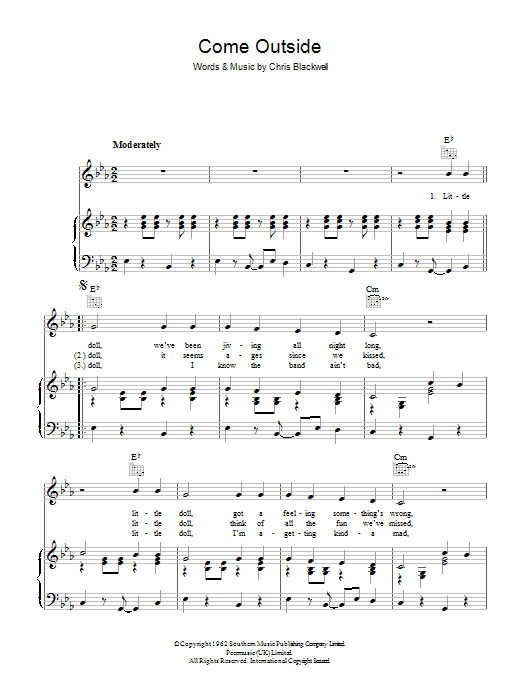 Download or print Mike Sarne Come Outside sheet music, chords and digital score arranged for Piano, Vocal & Guitar Chords. This Pop score includes 5 page(s).