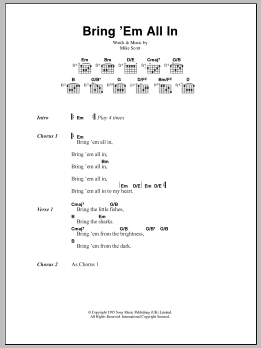 Download or print Mike Scott Bring 'Em All In sheet music, chords and digital score arranged for Guitar Chords/Lyrics. This Rock score includes 5 page(s).