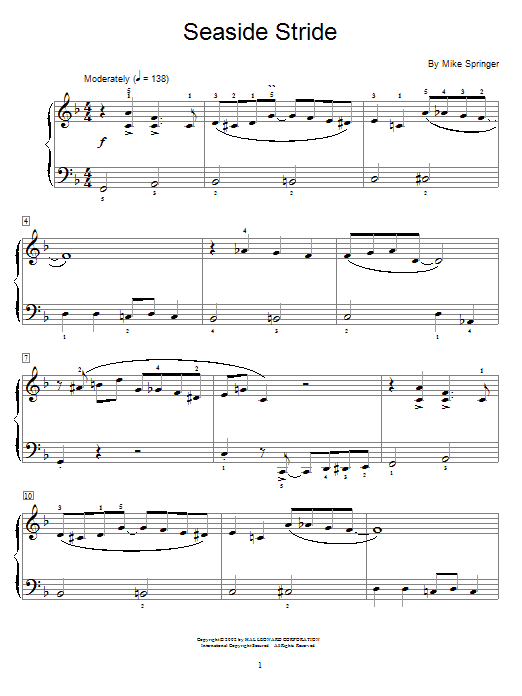 Download or print Mike Springer Seaside Stride sheet music, chords and digital score arranged for Educational Piano. This Children score includes 3 page(s).