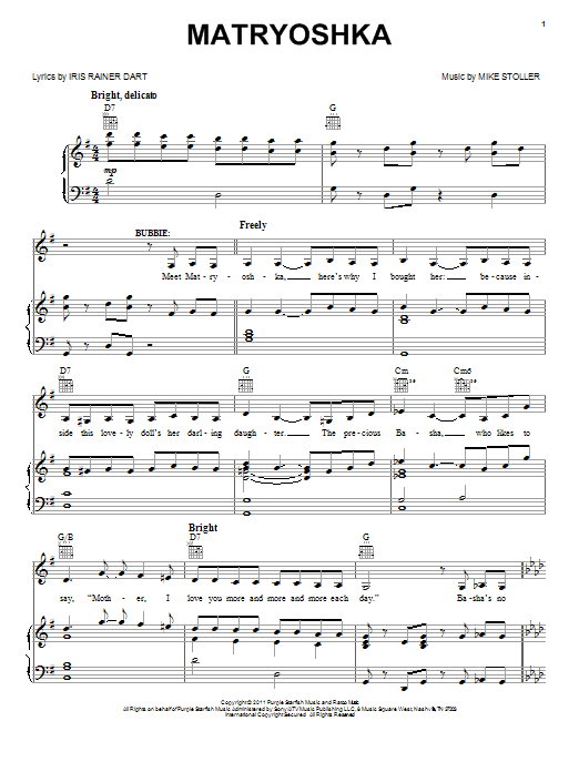 Download or print Mike Stoller Matryoshka sheet music, chords and digital score arranged for Piano, Vocal & Guitar Chords (Right-Hand Melody). This Broadway score includes 6 page(s).