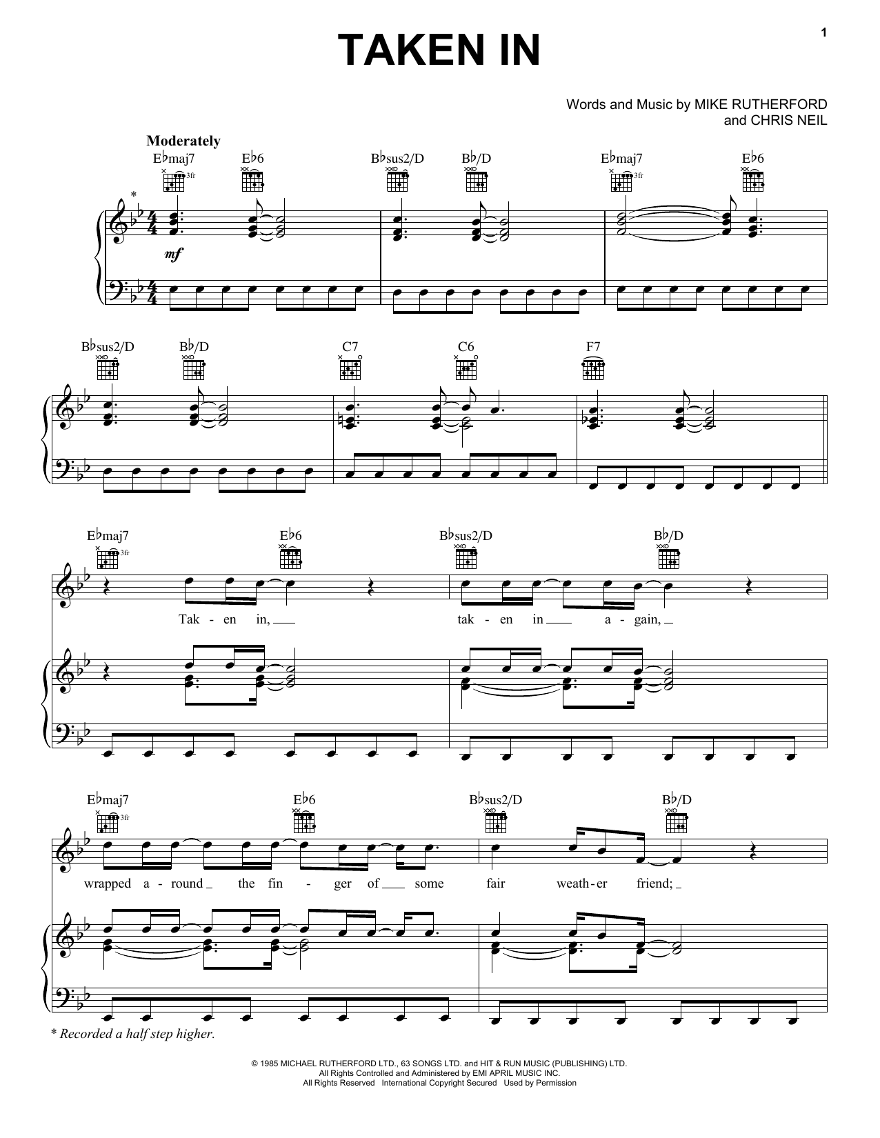 Download or print Mike + The Mechanics Taken In sheet music, chords and digital score arranged for Piano, Vocal & Guitar Chords (Right-Hand Melody). This Pop score includes 8 page(s).