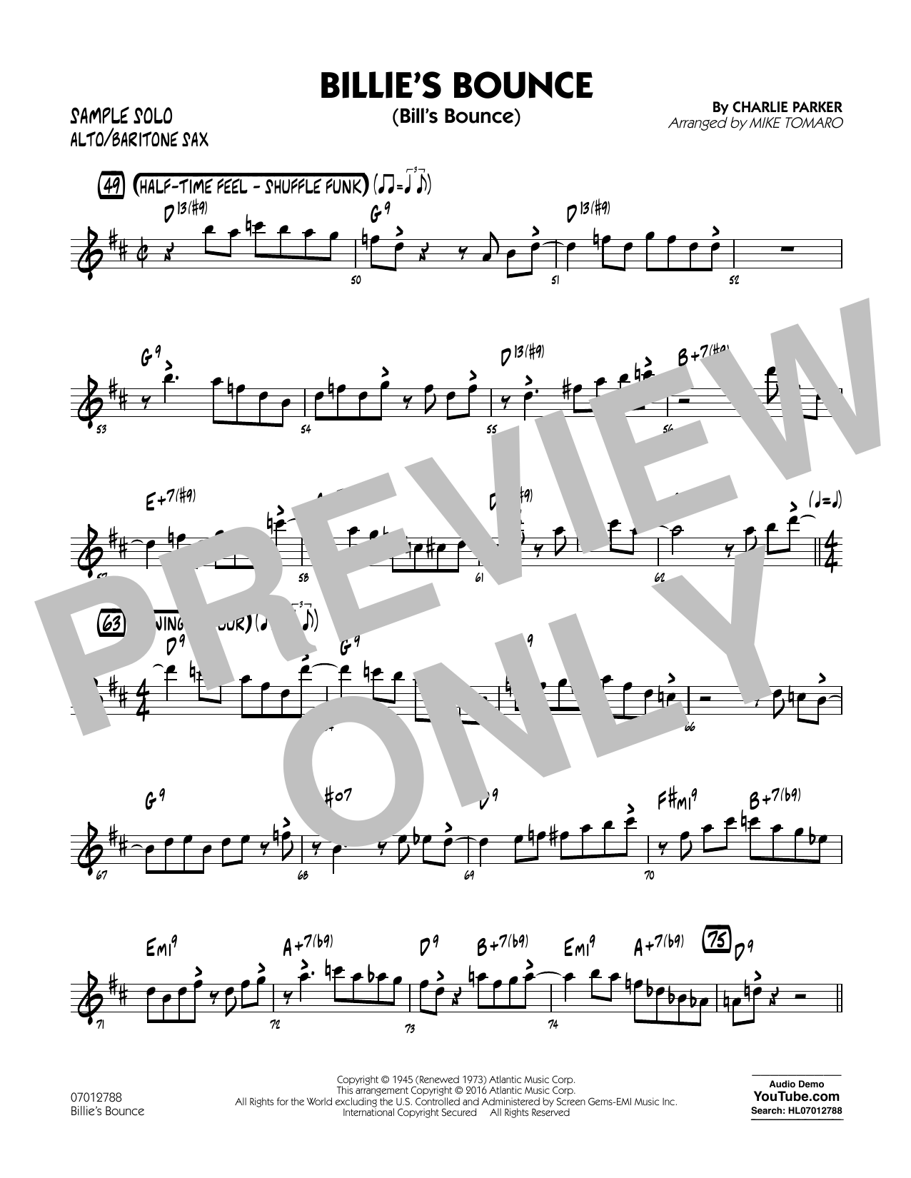 Download or print Mike Tomaro Billie's Bounce - Alto Sax/Bari Sax Sample Solo sheet music, chords and digital score arranged for Jazz Ensemble. This Jazz score includes 1 page(s).