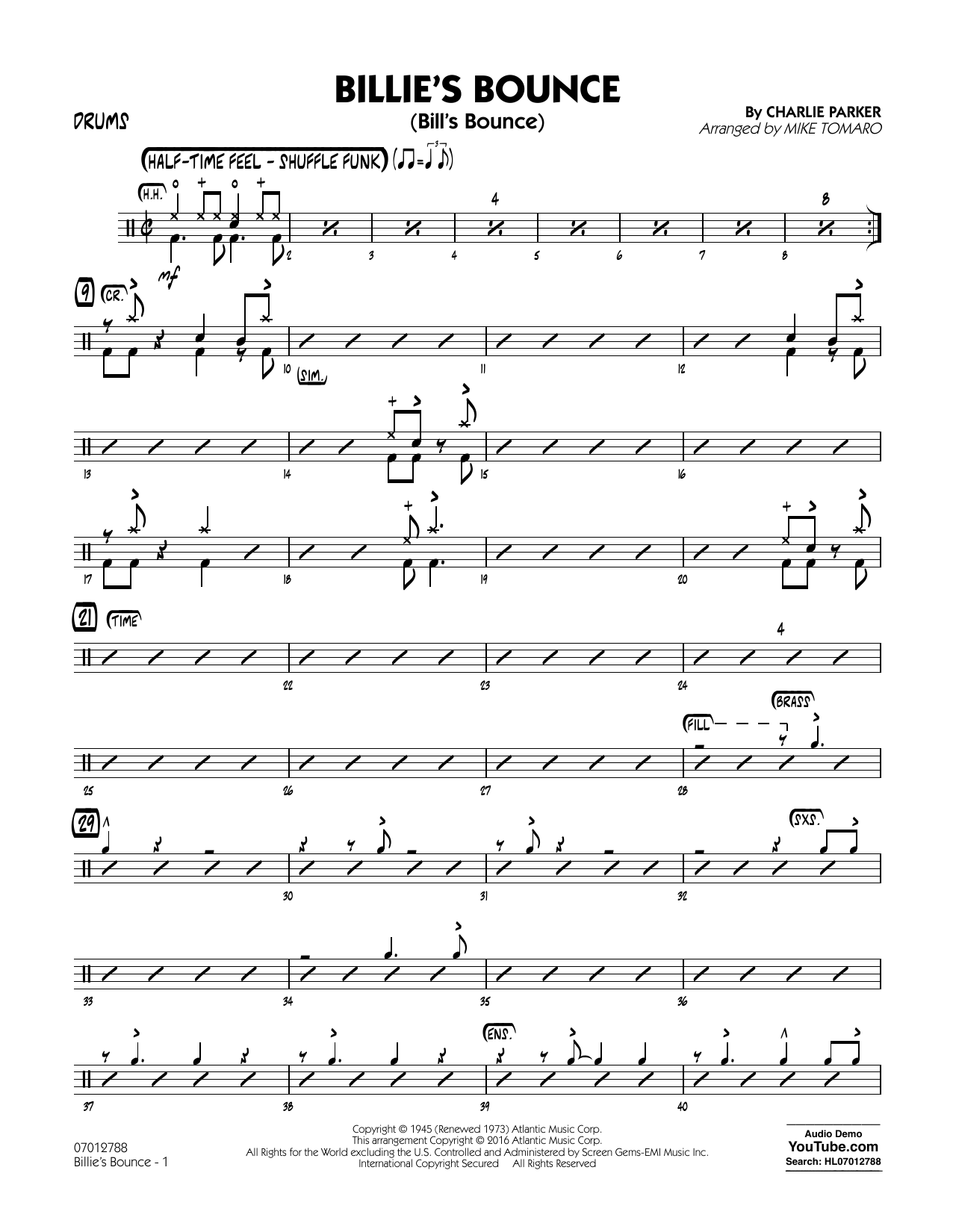 Download or print Mike Tomaro Billie's Bounce - Drums sheet music, chords and digital score arranged for Jazz Ensemble. This Jazz score includes 3 page(s).