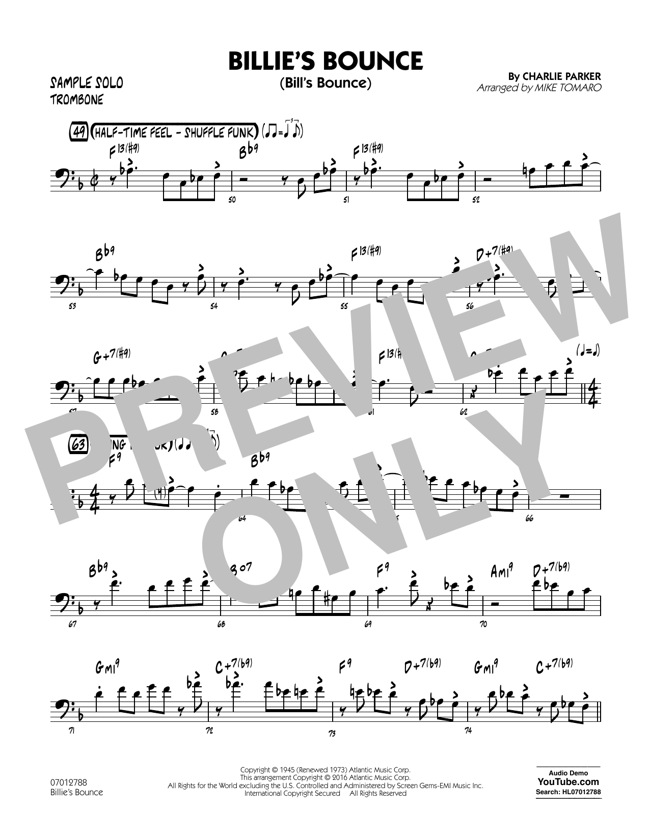 Download or print Mike Tomaro Billie's Bounce - Trombone Sample Solo sheet music, chords and digital score arranged for Jazz Ensemble. This Jazz score includes 1 page(s).