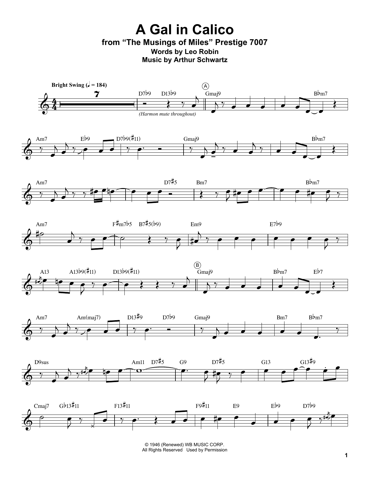 Download or print Miles Davis A Gal In Calico sheet music, chords and digital score arranged for Trumpet Transcription. This Jazz score includes 5 page(s).