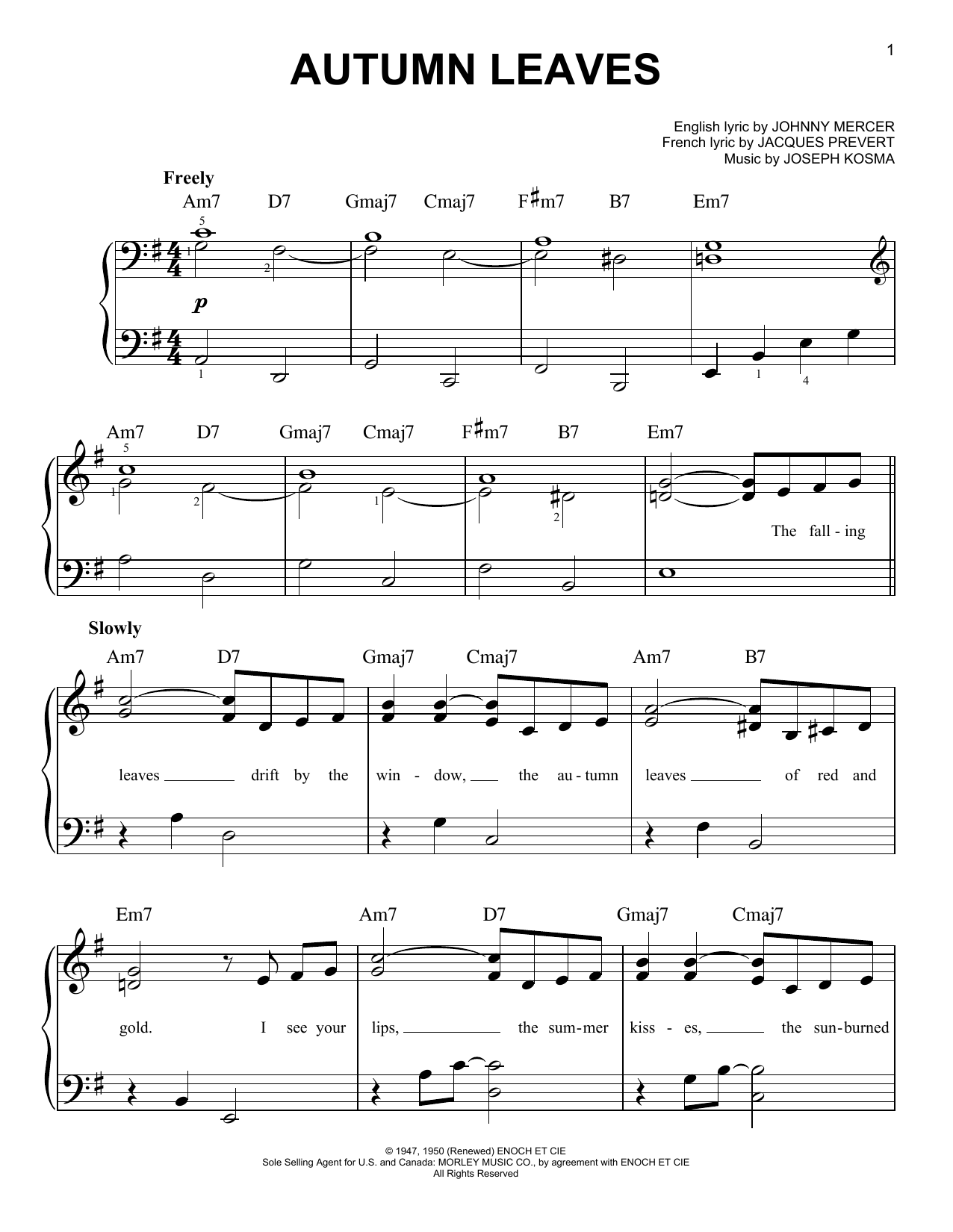 Download or print Miles Davis Autumn Leaves sheet music, chords and digital score arranged for Easy Piano. This Jazz score includes 2 page(s).
