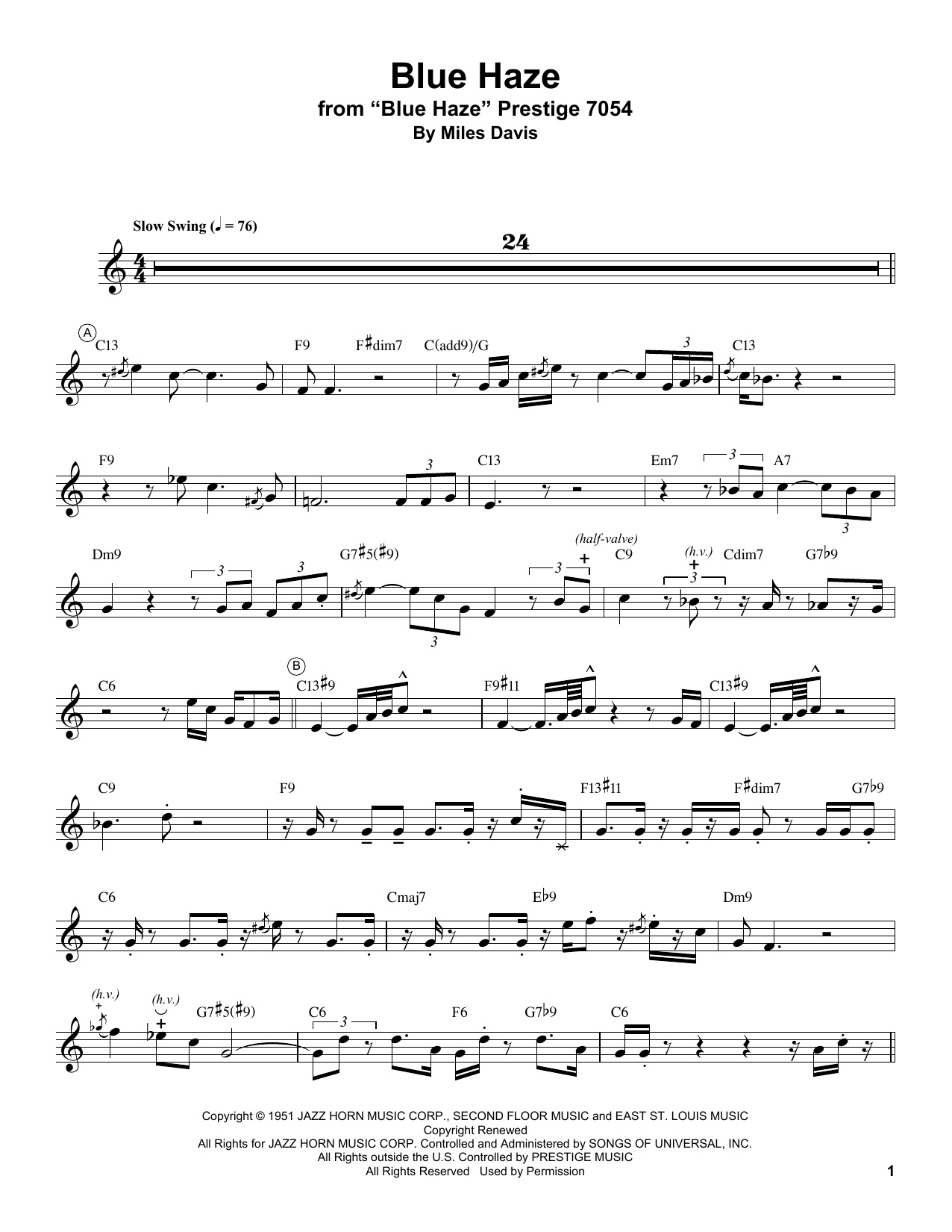 Download or print Miles Davis Blue Haze sheet music, chords and digital score arranged for Real Book – Melody & Chords. This Jazz score includes 1 page(s).