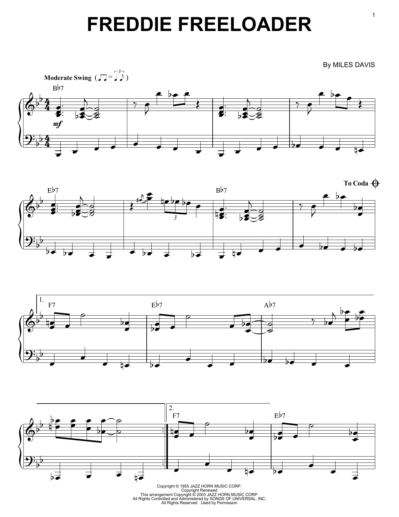 Download or print Miles Davis Freddie Freeloader sheet music, chords and digital score arranged for Real Book – Melody & Chords – Bb Instruments. This Jazz score includes 1 page(s).