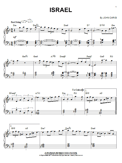 Download or print Miles Davis Israel sheet music, chords and digital score arranged for Piano Solo. This Jazz score includes 3 page(s).