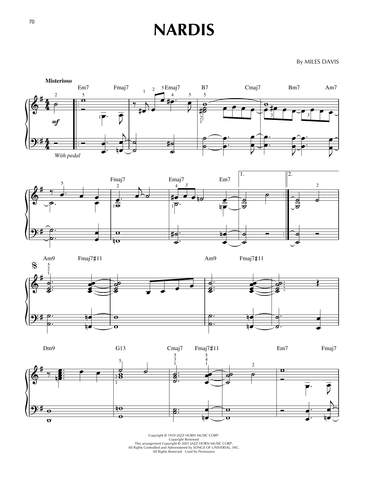 Download or print Miles Davis Nardis (arr. Brent Edstrom) [Jazz version] sheet music, chords and digital score arranged for Piano Solo. This Jazz score includes 4 page(s).