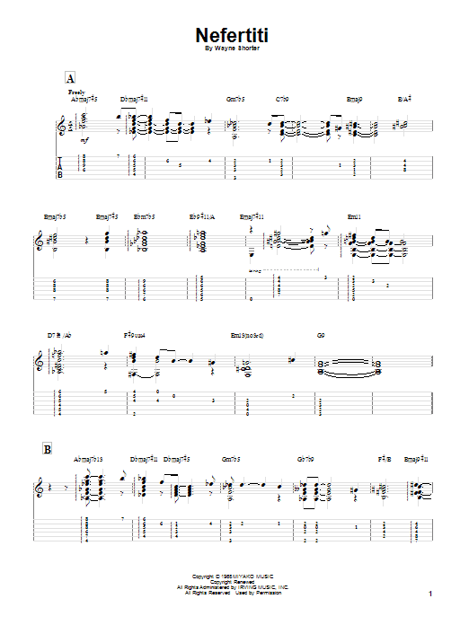 Download or print Miles Davis Nefertiti sheet music, chords and digital score arranged for Solo Guitar. This Jazz score includes 2 page(s).