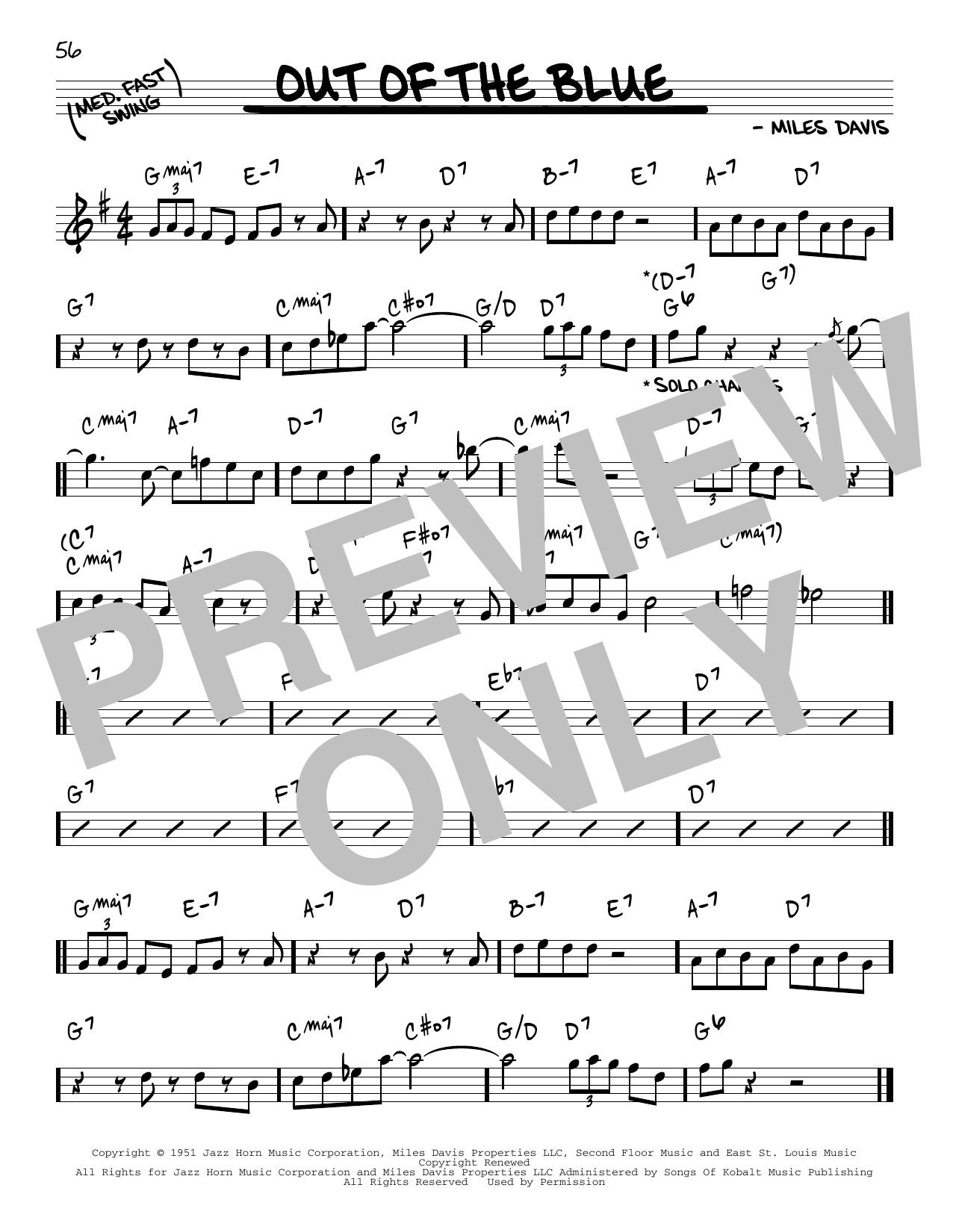 Download or print Miles Davis Out Of The Blue sheet music, chords and digital score arranged for Real Book – Melody & Chords. This Jazz score includes 1 page(s).