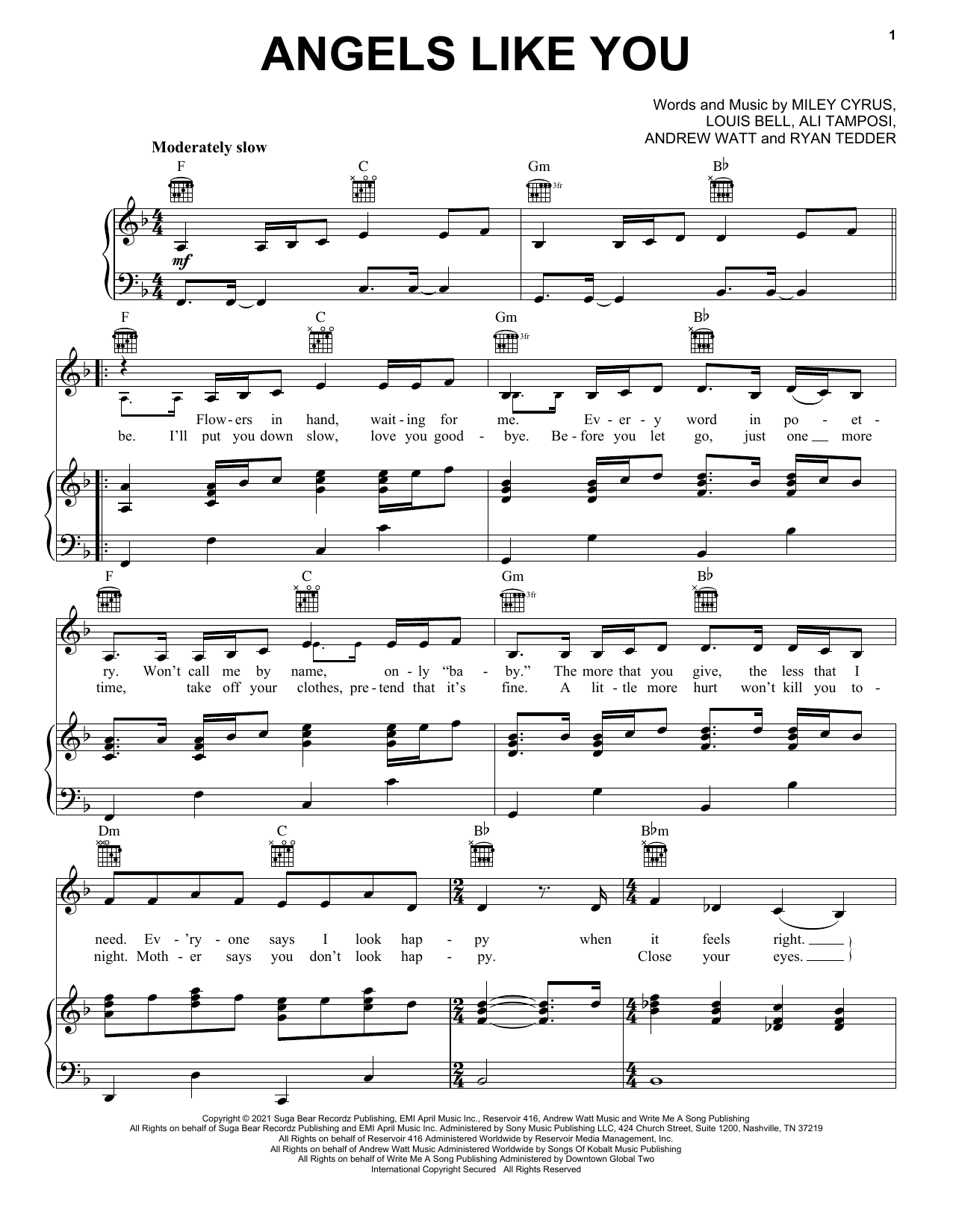 Download or print Miley Cyrus Angels Like You sheet music, chords and digital score arranged for Piano, Vocal & Guitar Chords (Right-Hand Melody). This Pop score includes 3 page(s).