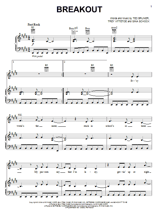 Download or print Miley Cyrus Breakout sheet music, chords and digital score arranged for Easy Piano. This Pop score includes 5 page(s).