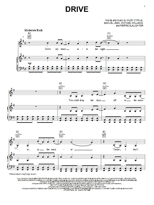 Download or print Miley Cyrus Drive sheet music, chords and digital score arranged for Piano, Vocal & Guitar Chords (Right-Hand Melody). This Pop score includes 11 page(s).