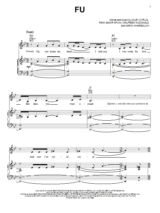 Download or print Miley Cyrus FU sheet music, chords and digital score arranged for Piano, Vocal & Guitar Chords (Right-Hand Melody). This Pop score includes 9 page(s).