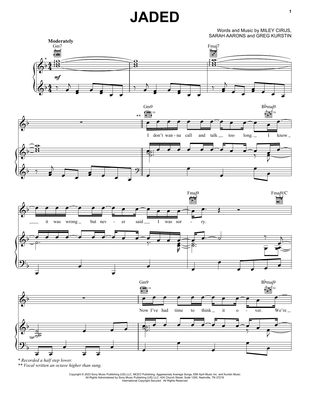Download or print Miley Cyrus Jaded sheet music, chords and digital score arranged for Easy Piano. This Pop score includes 6 page(s).