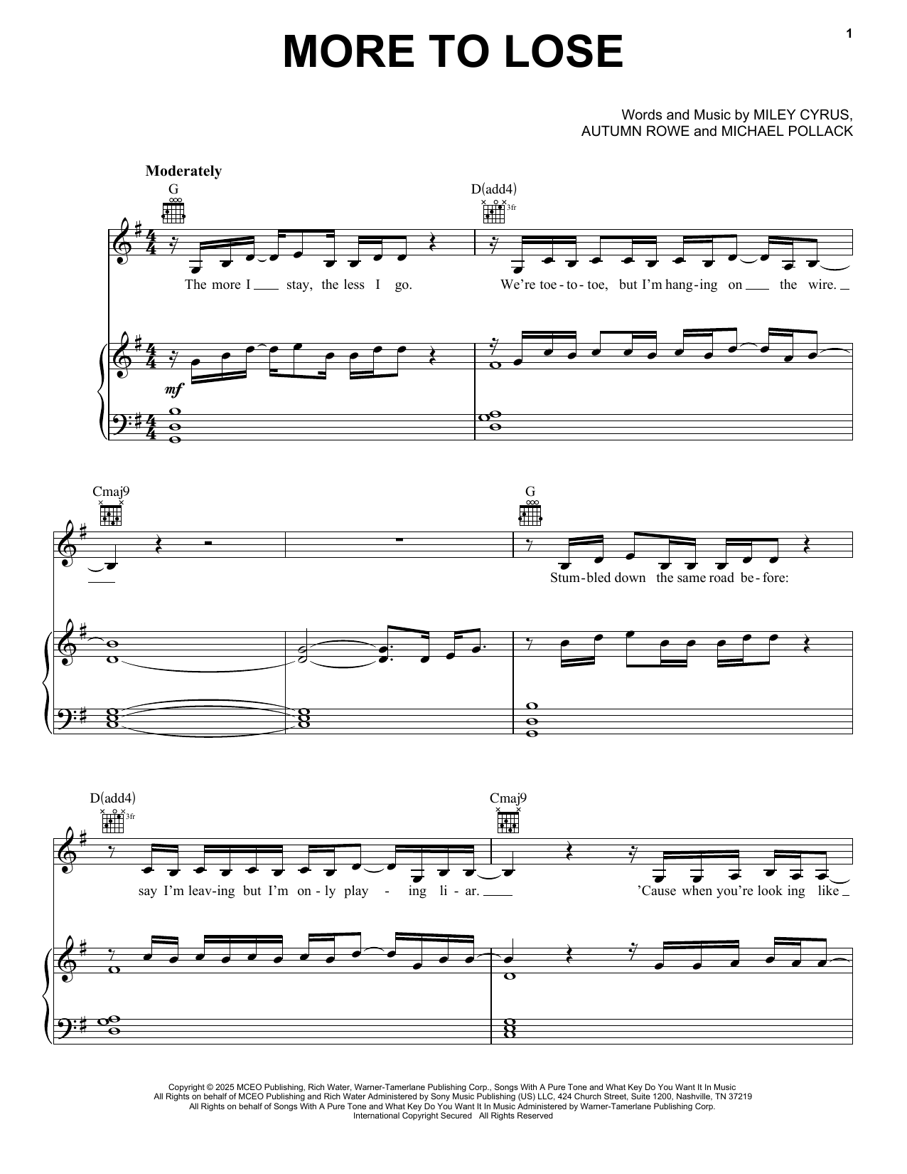 Download or print Miley Cyrus More To Lose sheet music, chords and digital score arranged for Piano, Vocal & Guitar Chords (Right-Hand Melody). This Pop score includes 9 page(s).