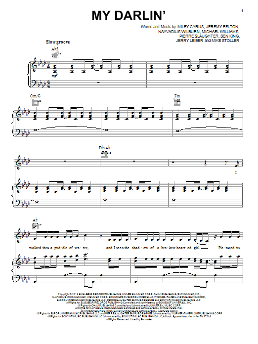 Download or print Miley Cyrus My Darlin' sheet music, chords and digital score arranged for Piano, Vocal & Guitar Chords (Right-Hand Melody). This Pop score includes 7 page(s).