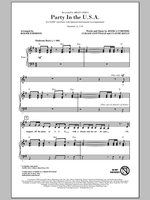 Download or print Miley Cyrus Party In The USA (arr. Roger Emerson) sheet music, chords and digital score arranged for SSA Choir. This Disney score includes 11 page(s).