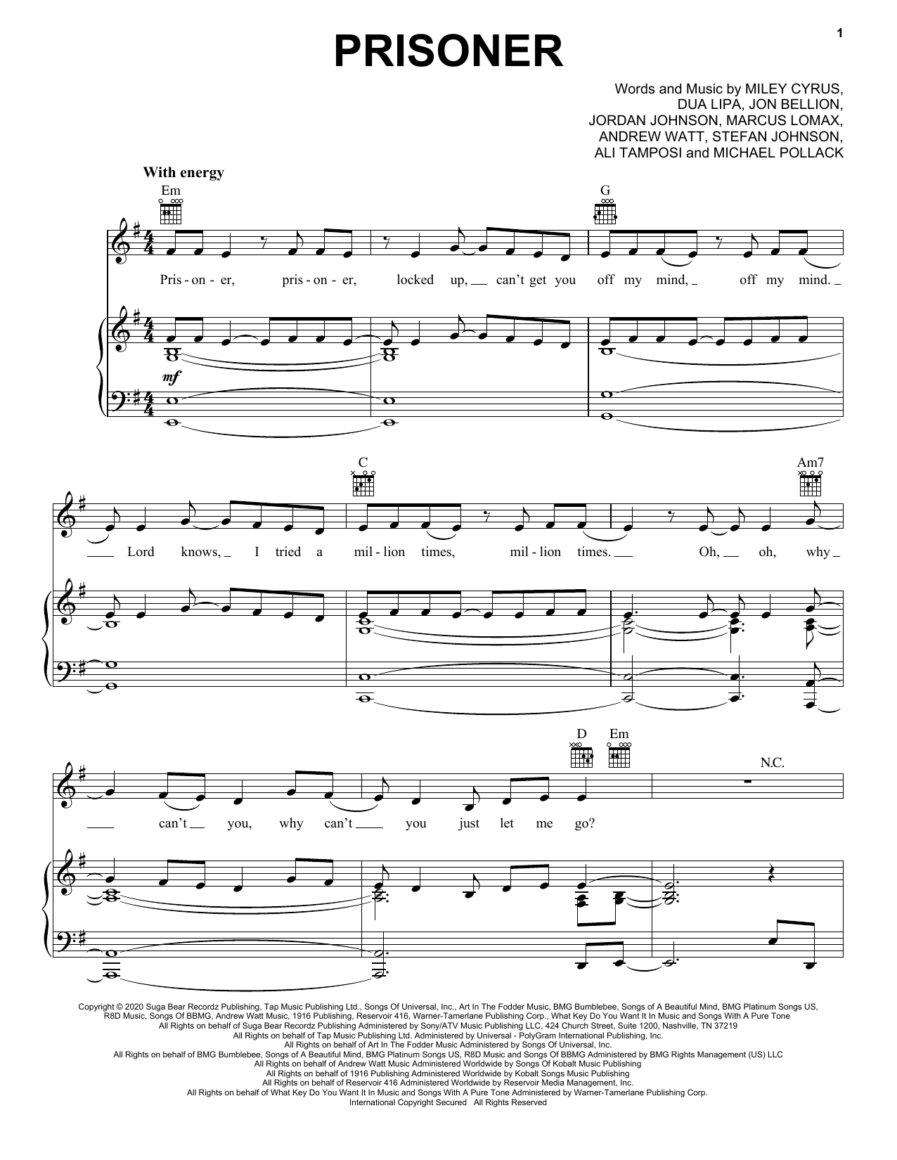 Download or print Miley Cyrus Prisoner (feat. Dua Lipa) sheet music, chords and digital score arranged for Easy Piano. This Pop score includes 6 page(s).