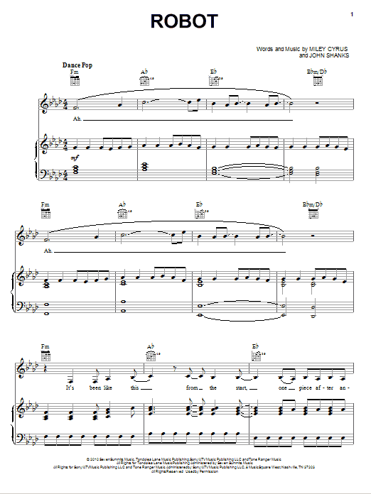 Download or print Miley Cyrus Robot sheet music, chords and digital score arranged for Piano, Vocal & Guitar Chords (Right-Hand Melody). This Pop score includes 8 page(s).