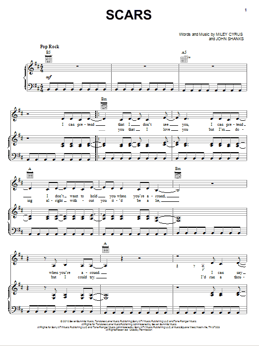 Download or print Miley Cyrus Scars sheet music, chords and digital score arranged for Piano, Vocal & Guitar Chords (Right-Hand Melody). This Pop score includes 6 page(s).
