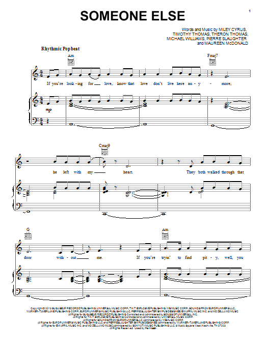 Download or print Miley Cyrus Someone Else sheet music, chords and digital score arranged for Piano, Vocal & Guitar Chords (Right-Hand Melody). This Pop score includes 10 page(s).