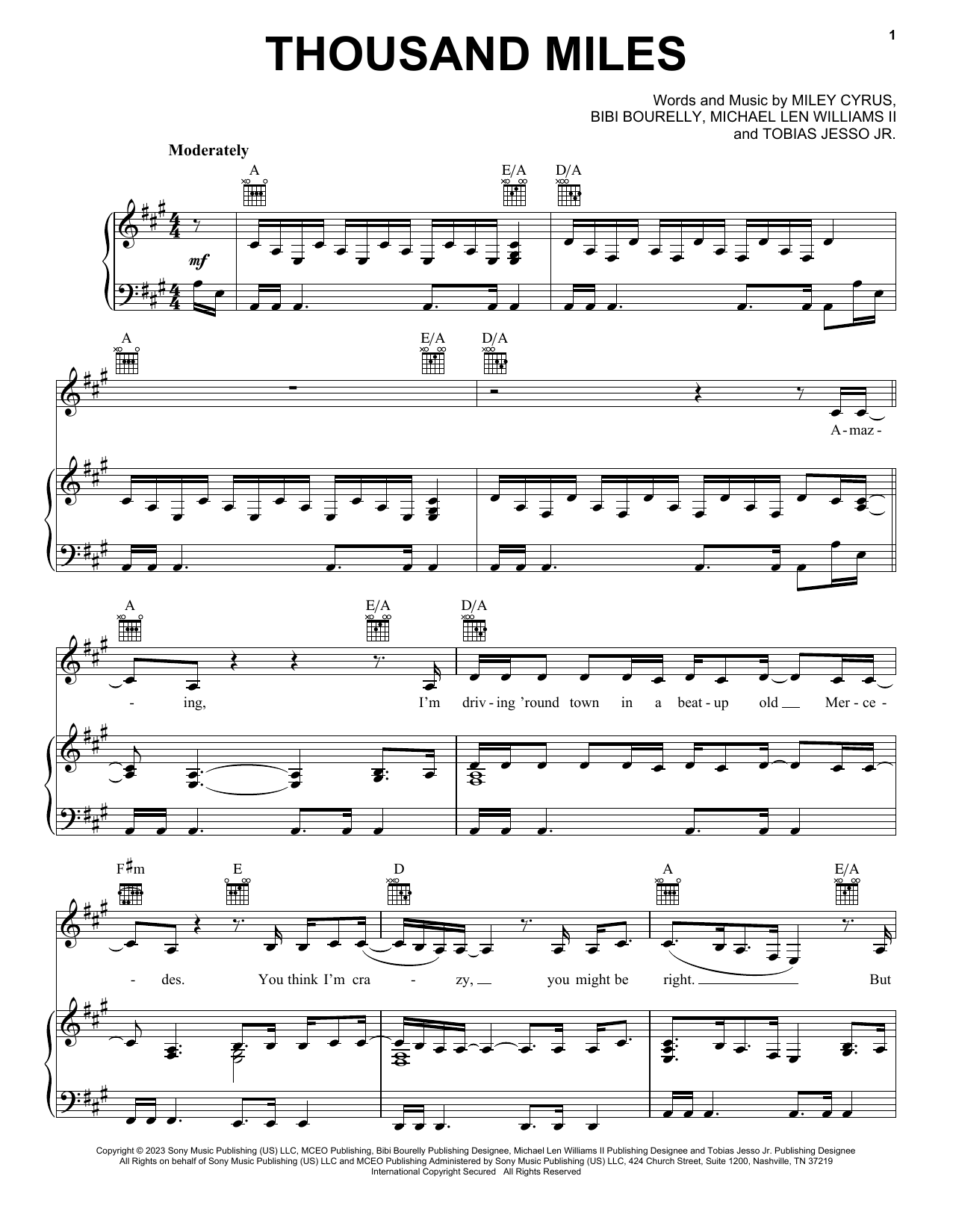 Download or print Miley Cyrus Thousand Miles (feat. Brandi Carlile) sheet music, chords and digital score arranged for Easy Piano. This Pop score includes 7 page(s).