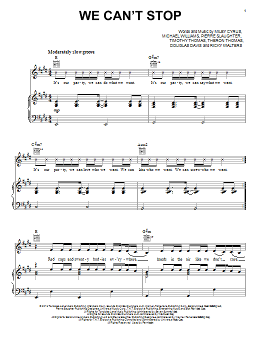 Download or print Miley Cyrus We Can't Stop sheet music, chords and digital score arranged for Easy Piano. This Pop score includes 6 page(s).